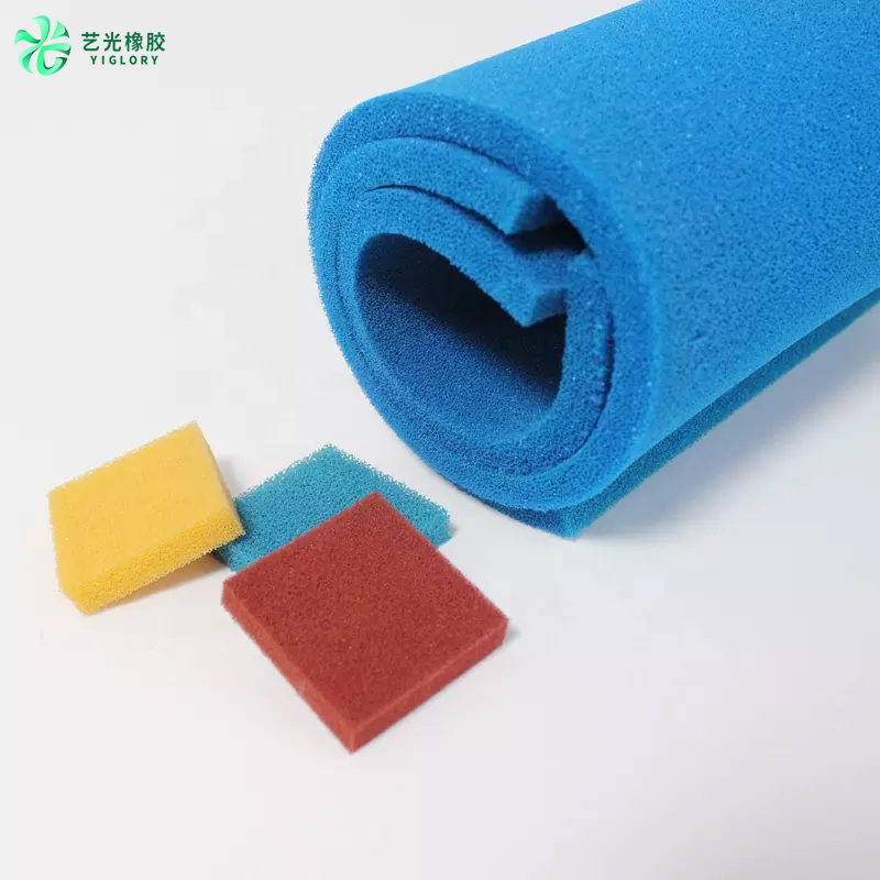 硅橡膠開孔海綿的形成:以高透氣性聚氨酯軟質(zhì)海綿載體,采用浸膠擠壓工藝,將液體硅橡膠包覆在所有高透氣性聚氨酯軟質(zhì)海綿所有經(jīng)絡(luò)上,硫化后,再經(jīng)過二次硫化,使內(nèi)部的聚氨酯海綿破壞,制成具有高透氣性的硅橡膠開孔海綿,該材料使用溫度范圍為-60250℃,平均孔徑范圍為1.5mm-0.2mm。