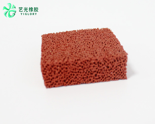 硅橡膠開孔海綿的形成:以高透氣性聚氨酯軟質(zhì)海綿載體,采用浸膠擠壓工藝,將液體硅橡膠包覆在所有高透氣性聚氨酯軟質(zhì)海綿所有經(jīng)絡(luò)上,硫化后,再經(jīng)過二次硫化,使內(nèi)部的聚氨酯海綿破壞,制成具有高透氣性的硅橡膠開孔海綿,該材料使用溫度范圍為-60-250℃,平均孔徑范圍為1.5mm-0.2mm。